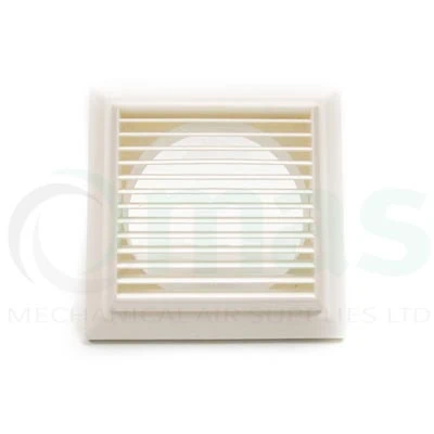 White external louvred plastic grille with fixed blades β 150mm Γ round spigot.